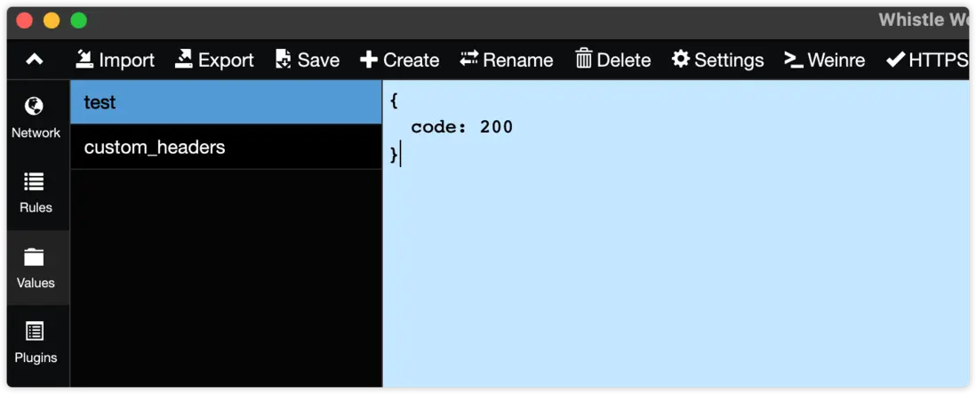 什麼意思呢?創建的每個規則都可以影響到請求,當規則後面打了✅就代表生效中;上方的test表示一個規則值,這個是用户創建的,下個章節我們講