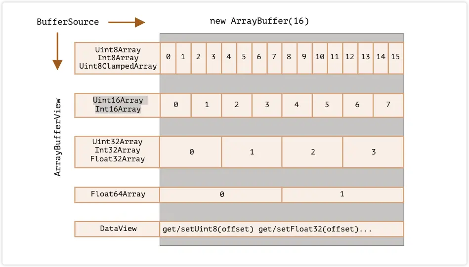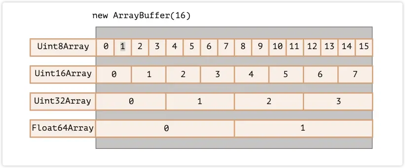 這些視圖對象看上去更像數組Array,但他們並不是數組而是在ArrayBuffer上統稱的類型術語,JS提供了多種視圖對象:Uint8Array、Int8Array、Uint16Array、Int16Array、Uint32Array、Int32Array、Float32Array、Float64Array、Uint8ClampedArray、BigInt64Array、BigUint64Array等等