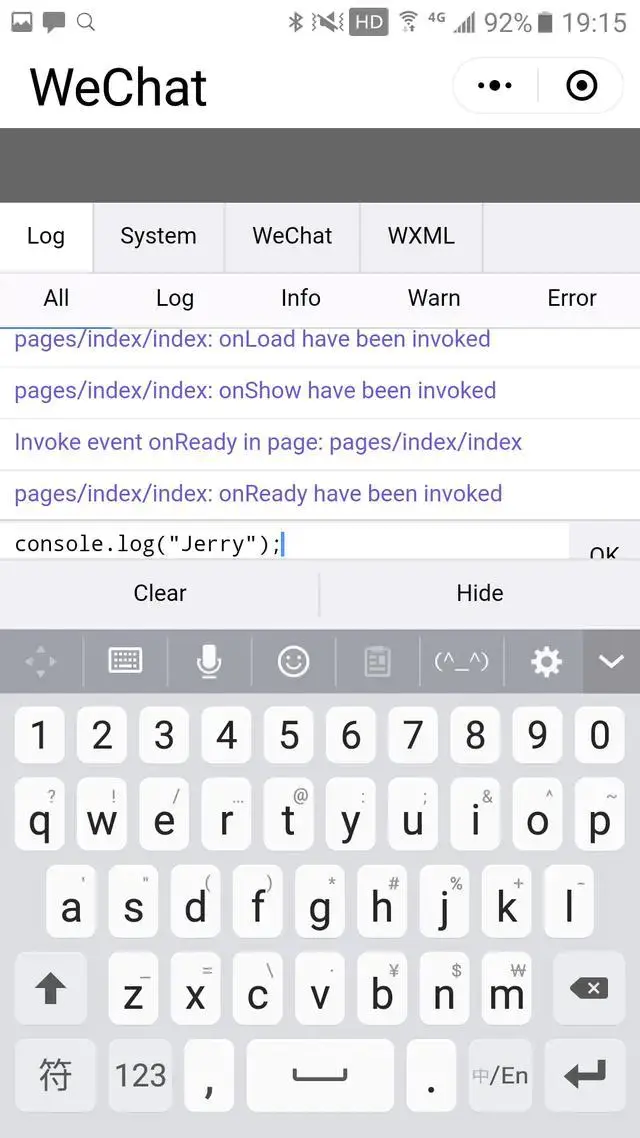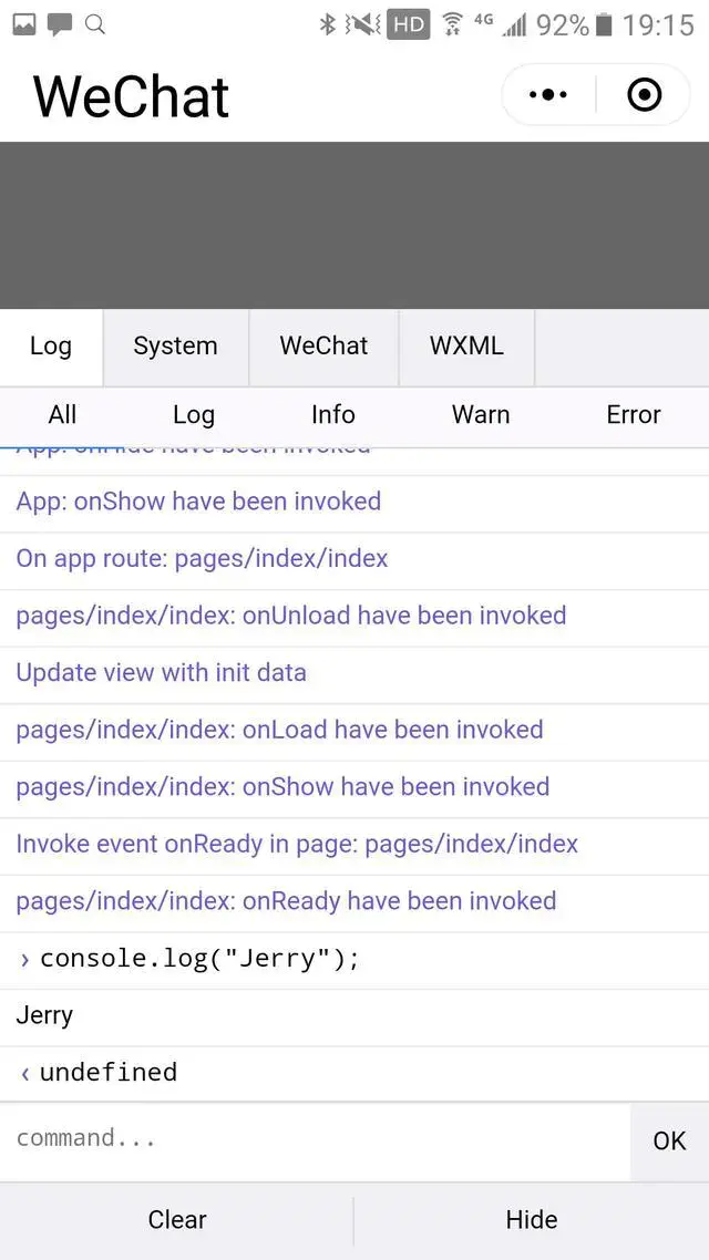 接着整個手機屏幕就被微信小程序的調試器充滿了。這個調試器和電腦上安裝的微信開發者工具相比,僅僅能顯示日誌和執行一些簡單的 JavaScript 操作,但是不能像電腦上那樣,進行 JavaScript 代碼的調試。