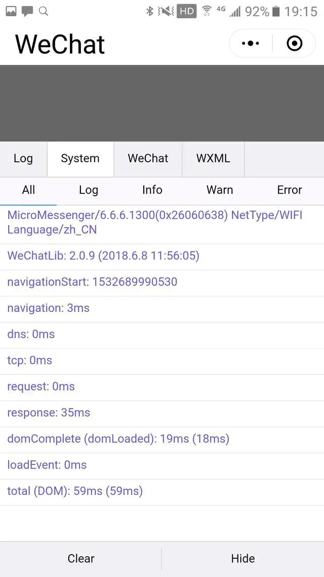 System 標籤頁可以看到一些微信小程序性能相關的參數和性能參數,比如: