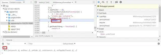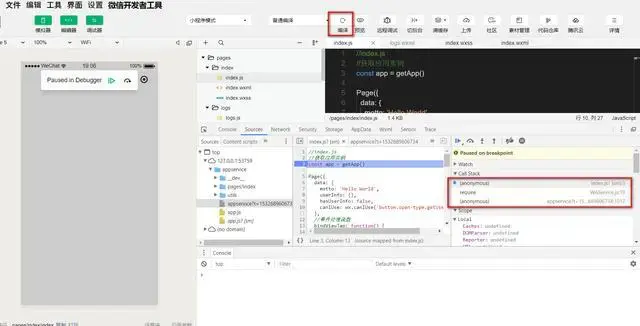 點擊 編譯 按鈕,我們的小程序自動啓動,設置在控制器裏的斷點就自動觸發了。這樣我們就可以通過單步調試的方式來學習微信小程序控制器的調用上下文了。