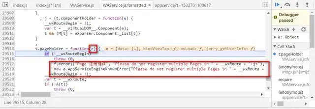 或者直接單步調試進去學習。下圖就是 Page 構造函數單步執行的情況,輸入參數 e 為一個Json 對象: