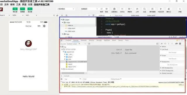 開發者工具右邊的區域現在從上到下一分為二:上面藍色區域還是代碼編輯頁面,下面紅色區域就是微信小程序的調試工具。