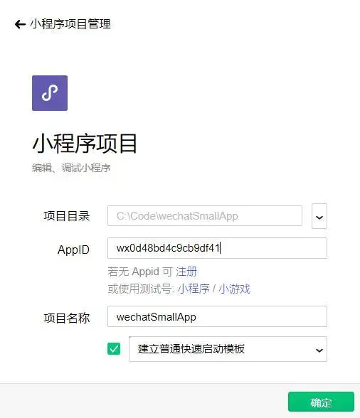 直接填進去,勾上 建立普通快速啓動模板,然後微信開發者工具會自動幫我們創建一個 Hello World 版本的微信小程序資源文件出來。