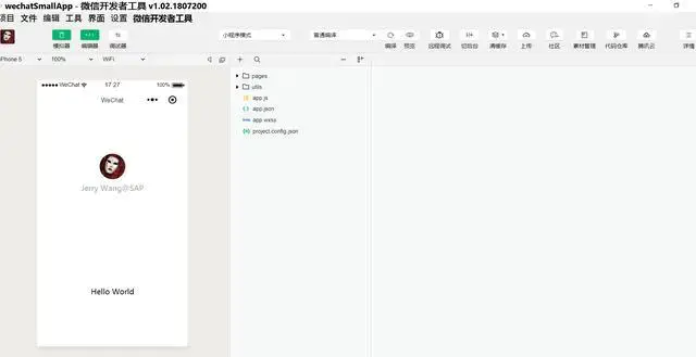點擊前往體驗版, 就能看到微信開發者工具自動生成的 Hello World 小程序了。
