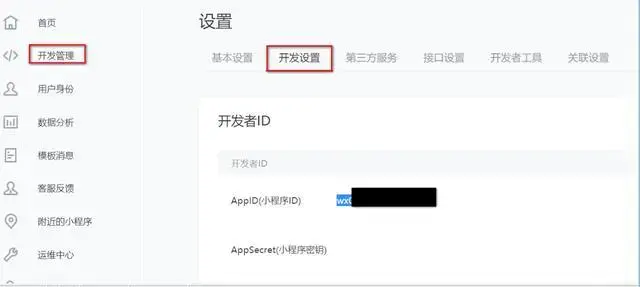 在開發管理->開發設計菜單裏,找到我們剛才註冊的微信小程序的 ID:抄下來,後面要用。