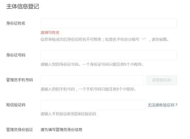 激活之後,就可以進入小程序主體信息登記頁面了。這裏需要使用身份證號碼和手機驗證碼進行登記。