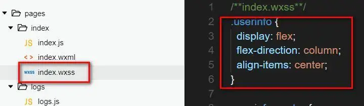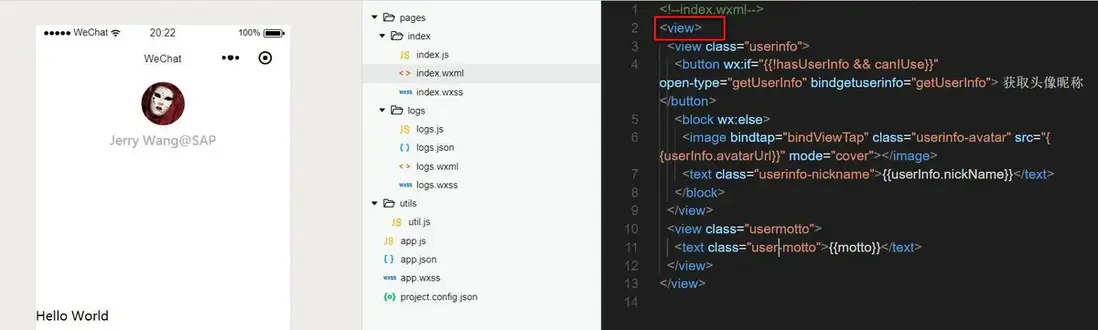 第三行:<view class="userinfo"> 其中 view 元素可以嵌套,相當於原生 HTML 裏的 div 元素。此處定義了另一個 view 元素,css 類為 userinfo. 這個 css 類不是微信提供的,而是我們自己開發的,位於文件 index.wxss 裏: