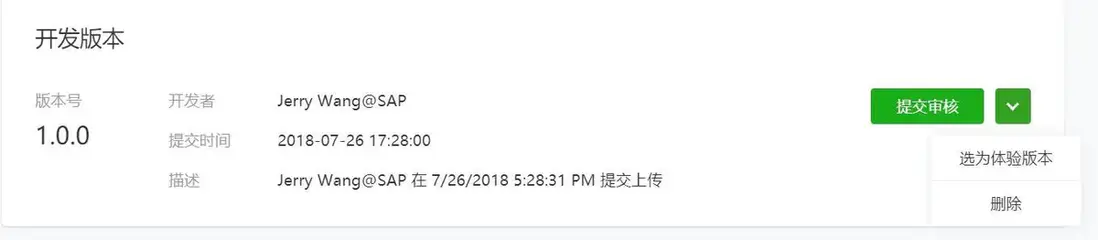 然後回到小程序管理後台,能看到我們上面通過微信開發者工具上傳的 1.0.0 版本的小程序了。我們點擊 提交審核 右邊的下拉菜單,選擇 選為體驗版本