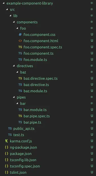 接下來我們將添加一個組件、一個管道和一個指令。 我們將遵循一種為每個模塊添加一個組件的模式——這將允許消費應用程序僅導入它感興趣的庫模塊,然後在構建過程中對所有其他模塊進行 tree shaken. 我強烈建議這樣做,因為隨着庫的增長,它確實會對應用程序包的大小產生影響。