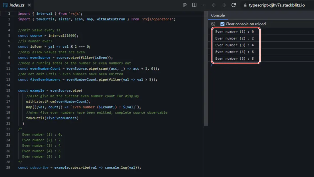 withLatestFrom將兩個 Observable 進行連接,從而在 map Operator 裏,可以同時打印出當前發射的偶數值和偶數總量。通過 takeUntil 傳入一個只有在偶數總數個數大於 5 時才發射值的 Observable,可以做到偶數總數大於 5 之後,讓 interval 停止值的發送。