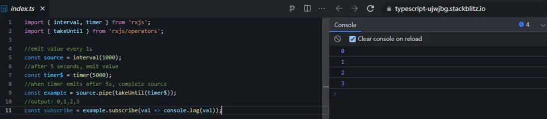 這個例子裏,interval 作為原始的 Observable,clicks 作為 notification Observable,整個程序的表現形式是,每個 1 秒有一個遞增1的整數序列打印,直至頁面發生點擊事件時,原始 interval Observable 終止。