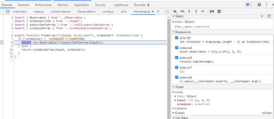 注意,上圖第 8 行的 for 循環,顯然在 of 函數調用裏不會執行,而是 of 返回的 Observable 被 subscribe 時才執行。subscribeToArray 的邏輯就是,一個簡單的 for 循環,循環體內依次調用 subscriber 的 next 方法,最後調用 complete 方法。