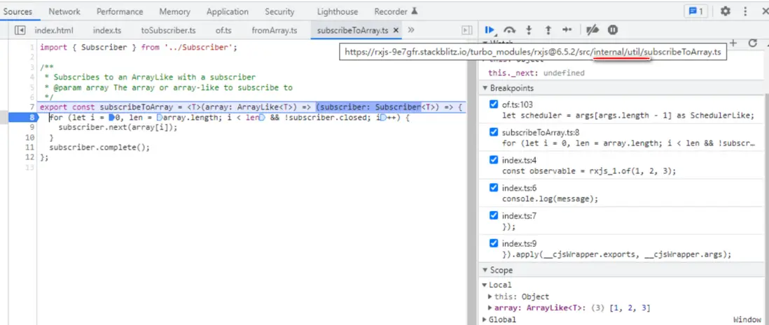 subscribeToArray 的實現在一個 subscribeToArray.ts 文件裏,這個文件的命名空間如下:internal/util