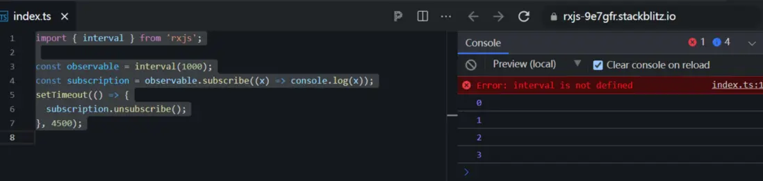 如果是一個週期性發射數據的 Observable,我們還可以使用 unsubscribe 對其取消訂閲。看下面的代碼: