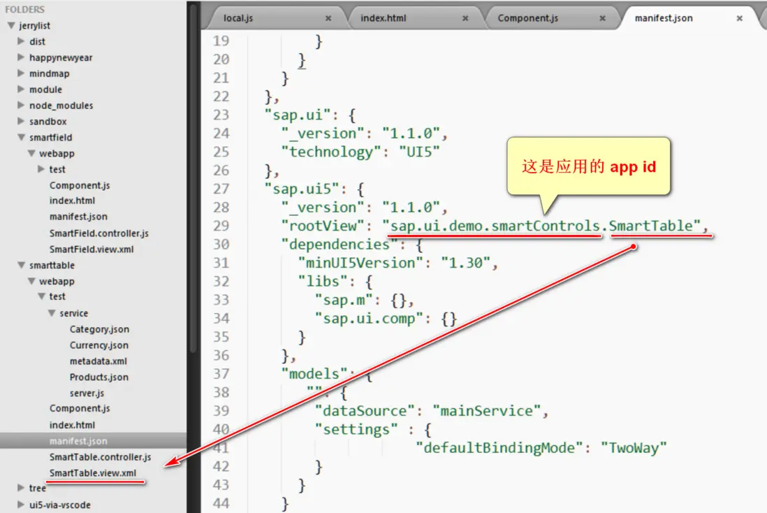 sap.ui5 區域裏,定義該應用的根視圖 (rootView)為 SmartTable:
