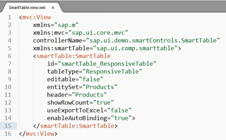 - SmartTable.view.xml 的源代碼: