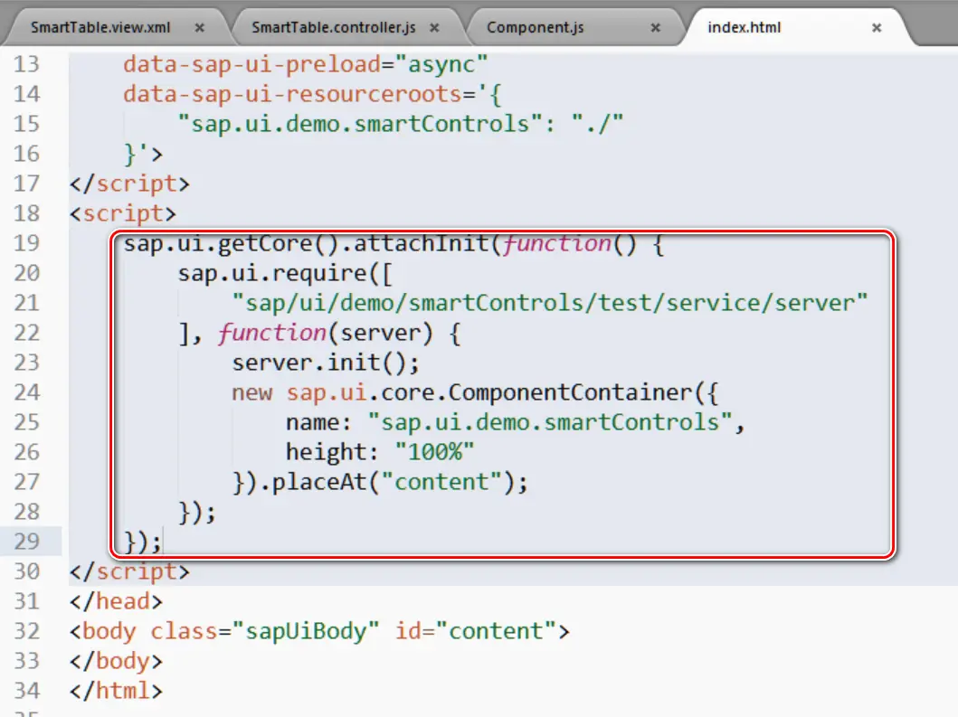 - 主要的邏輯位於 sap.ui.core 的 Init hook 實現函數裏。加載項目工程文件夾 test/service 下面的 server.js, 啓動這個 mock server,然後將 sap.ui.demo.smartControls 這個 Component,放置到ComponentContainer,即 Component 容器裏渲染成最後的 HTML 源代碼:
