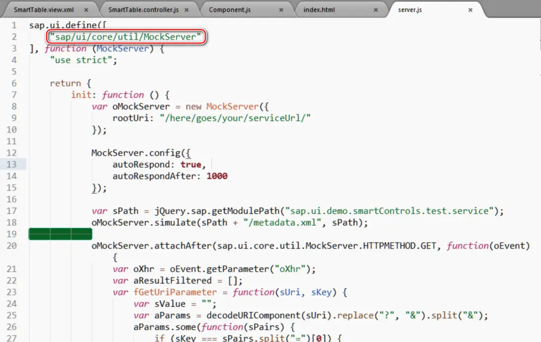 使用的是 SAP UI5 提供的標準 Mock server,位於目錄 sap/ui/core/util/MockServer 下面。