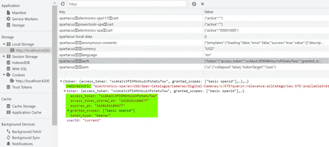 SAP Commerce Cloud UI 通過將訪問令牌持久化到瀏覽器的 Local Storage 中來實現上述場景。