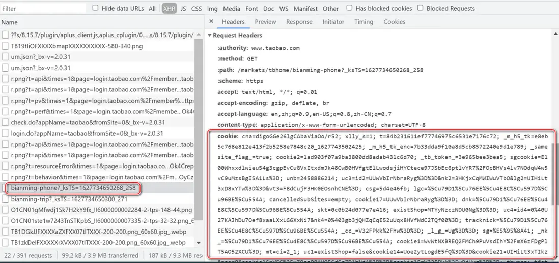 該頁面的 HTML 源代碼,並不是靜態編寫於首頁的 HTML 文件中,而是通過一個叫做 bianming-phone("便民"的拼音加上"手機"的英文單詞 phone) 的 HTTP 請求,從後台讀取到前台,然後再注入到前台頁面中:
