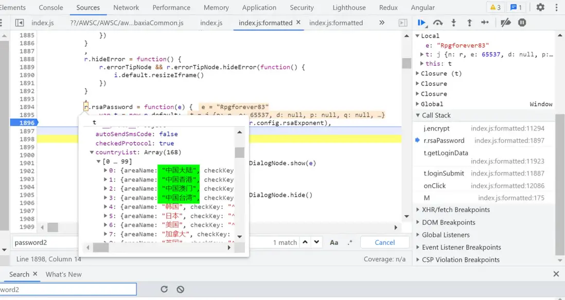 這個 index.js 裏還能發現一些有趣的東西。比如提供了 rsaPassword 方法的模塊內部,還維護了一個支持的國家列表,countryList,裏面有 168 個國家和地區: