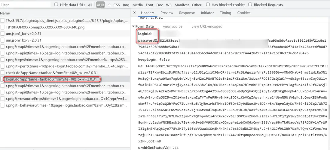 該請求的 Form Data 中包含 loginId 和 password2 兩個字段,分別維護了用户輸入的用户名的明文,以及密碼進行 RSA 加密後的值。