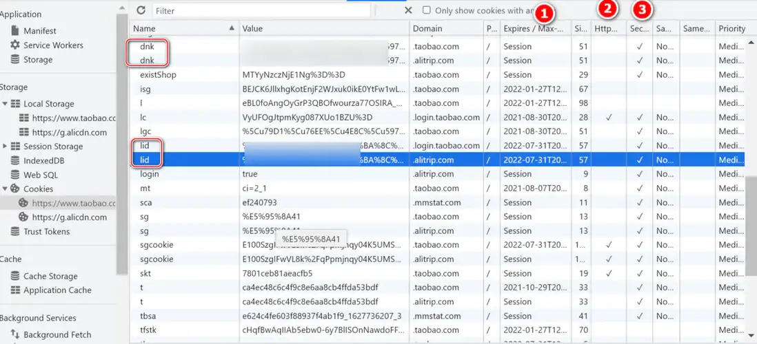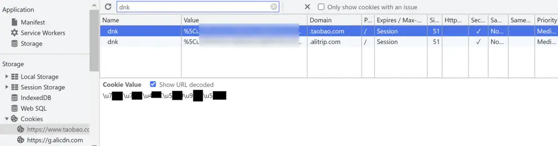 這個電商網站服務器頒發的 Cookie 裏,字段 lid 存儲的是用户名經過 URL encode 之後的值,dnk 存放的是用户名的 Unicode: