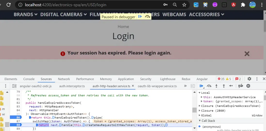 如果刷新令牌的過期時間也到達了,該怎麼辦?沒有刷新令牌,也就無從獲取新的訪問令牌。因此,我們會將用户重定向到登錄頁面,顯示一條“Session expired”的提示信息,讓其登錄之後,重新獲取訪問令牌和刷新令牌。