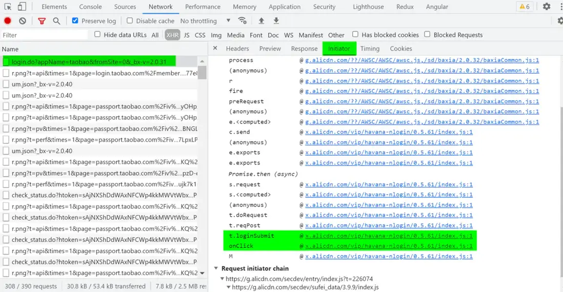 在 Chrome 開發者工具裏找到 login 請求,在 Initiator 面板裏找到發起該請求的調用棧。稍有經驗的前端開發人員,從 onClick 和 t.loginSubmit 就能推斷出,用户名和密碼的輸入框,實現在一個 Form 表單裏,點擊登錄按鈕後,觸發表單的 Submit.