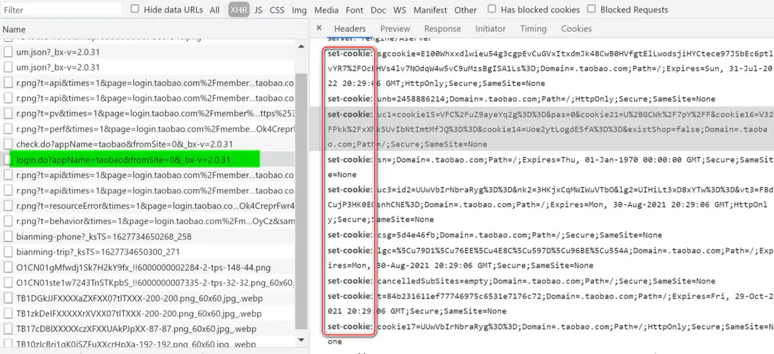 用户成功登錄之後,服務器創建對應的 Session 對象,返回給 login HTTP 請求的響應頭部,包含了很多 set-cookie 字段: