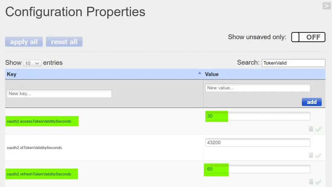 而我們團隊的開發人員,在開發 SAP Commerce Cloud UI 用户會話管理功能,進行各種邊界條件的測試時,為了方便起見,通常將自己本地搭建的 Commerce 服務器上令牌的過期時間進行了調整。比如下圖的例子,二者分別調整為30秒和60秒之後過期: