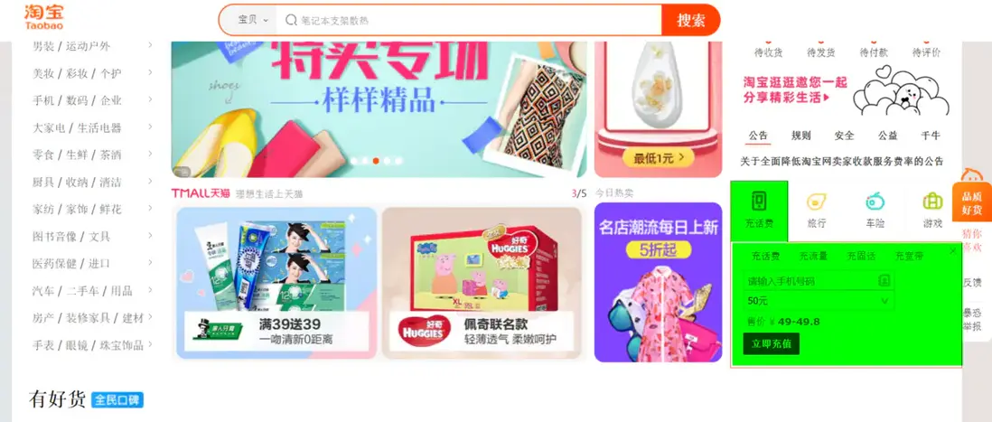 此外,我們在這個電商網站首頁右邊區域,能看到快速充值話費的面板,如下圖綠色高亮區域所示: