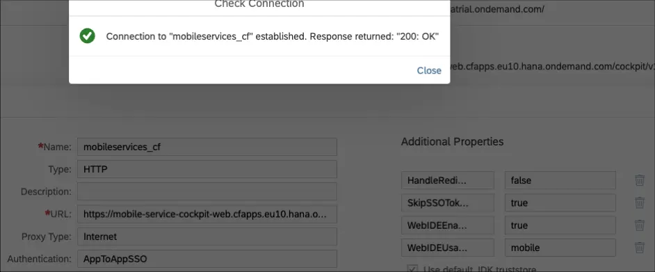 我們要在Neo環境的WebIDE裏控制CloudFoundry環境的mobile服務,因此需要創建Destination,指向CloudFoundry mobile services的admin url:
