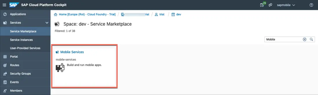 在CloudFoundry環境的Service Market裏找到Mobile Services,啓用之後,