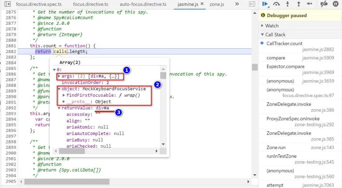 spiedFirstFocusable是spyOn方法針對實例keyboardFocusService的findFirstFocusable方法進行監控後返回的句柄。藉助該句柄,我們可以使用toHaveBeenCalledTimes方法,得到其在單元測試過程中實際調用的次數。