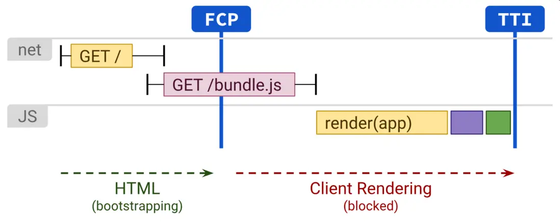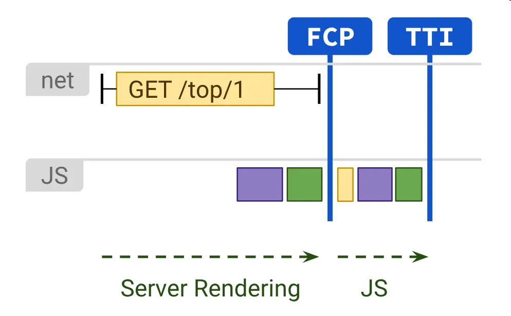 服務器渲染通常會產生快速的首次繪製 (FP) 和首次內容繪製 (FCP)。 在服務器上運行頁面邏輯和渲染可以避免向客户端發送大量 JavaScript,這有助於實現快速交互時間 (TTI)。 這是有道理的,因為通過服務器渲染,您實際上只是向用户的瀏覽器發送文本和鏈接。 這種方法可以很好地適用於各種設備和網絡條件,並開啓了有趣的瀏覽器優化,例如流式文檔解析。