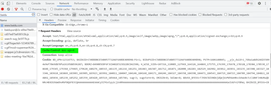 再觀察請求的頭部字段:cache-control: max-age=0