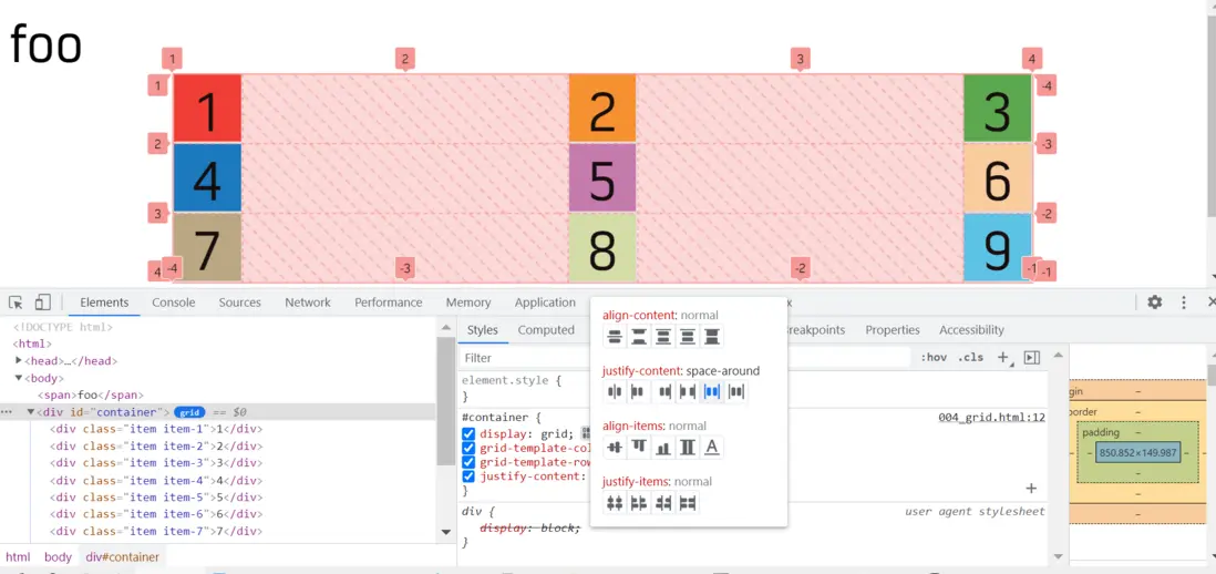 當頁面上的 HTML 元素應用了 display: grid 或 display: inline-grid 時,您可以在“樣式”窗格中看到它旁邊出現一個圖標。 單擊該圖標可切換 CSS 網格編輯器。 在這裏,您可以使用屏幕圖標(例如 justify-content: space-around)預覽潛在的變化,只需單擊一下即可創作網格外觀。