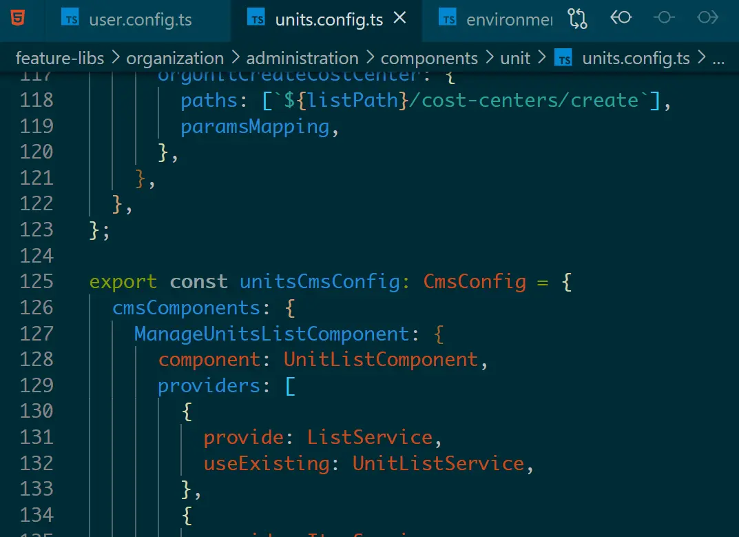 這裏同 User Mapping 實現有差異。在 User CMS mapping 裏,ManageUsersListComponent 對應 ListComponent,而對於 Org Unit,Commerce 後台 ManageUnitsListComponent,映射到 SAP Spartacus Component 是 UnitListComponent,而不是更通用的 ListComponent.
