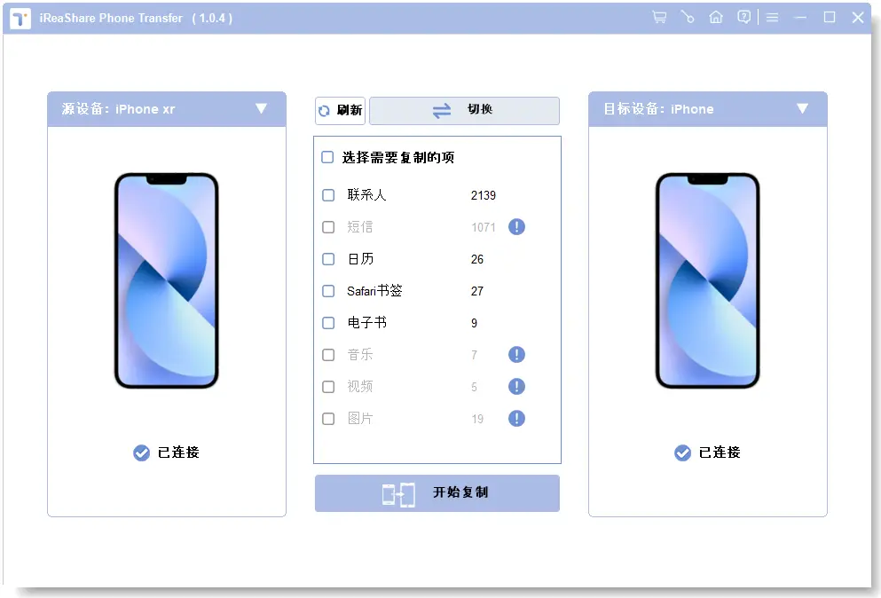 - 要繼續,請選擇所需的數據類型,然後單擊“開始複製”以立即開始傳輸。