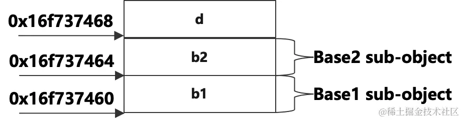 對象的總大小是12字節,它是子類自身擁有的一個數據成員4字節加上分別從兩個父類繼承而來的兩個數據成員共8字節的總和。從輸出的地址可以看出來,從父類Base1繼承來的成員b1和對象的首地址相同,接着是從父類Base2繼承而來b2,最後是子類自己的成員d,説明對象的佈局是從b1開始,然後是b2,最後是d,這個跟繼承的順序有關,第一繼承而來的數據成員排在最前面,按照在類中聲明的順序依次排列,其次是第二繼承而來的數據成員,以此類推,最後是子類自己的數據成員。佈局示意圖如下: