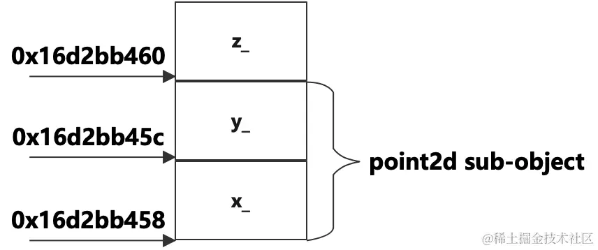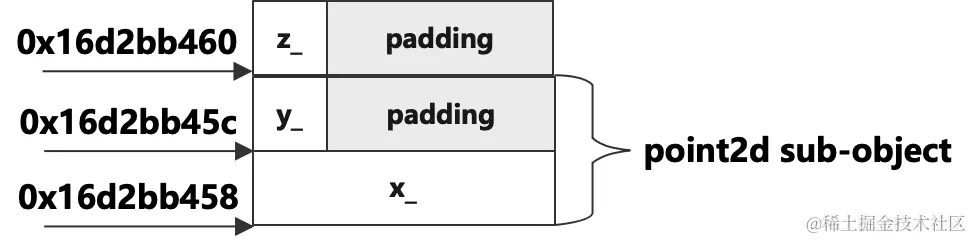類point3d只有一個數據成員z_,但大小卻有12字節,很明顯它的大小是加上父類point2d的大小8字節的。從輸出的地址看,p3d的地址是0x16d2bb458,從父類繼承而來的x_的地址也是0x16d2bb458,這説明從父類繼承而來的數據成員排列在前面,從對象的首地址開始,按照它們在類中的聲明順序依次排序,接着是子類自己的數據成員,從上面的結果看起來對象中的數據成員在內存中是按照順序且緊湊的排列在一起的,如下圖所示: