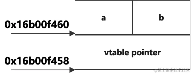 在沒有增加任何數據成員的情況下,對象的大小增加到了16字節,這説明虛函數的加入改變了對象的內存佈局。那麼增加的內容是什麼呢?我們看到輸出的打印中對象的首地址為0x16f97f458,而數據成員a的地址為0x16f97f460,這中間剛好差了8字節。而從上面的分析我們知道,原來a的地址是和對象的首地址是一樣的,也就是説對象的內存佈局是從a開始排列的,而現在在對象的起始地址和成員變量a之間空了8個字節,那麼排在a之前的這8個字節的內容是什麼呢?我們加點代碼把它的內容輸出出來,在main函數中加入以下代碼: