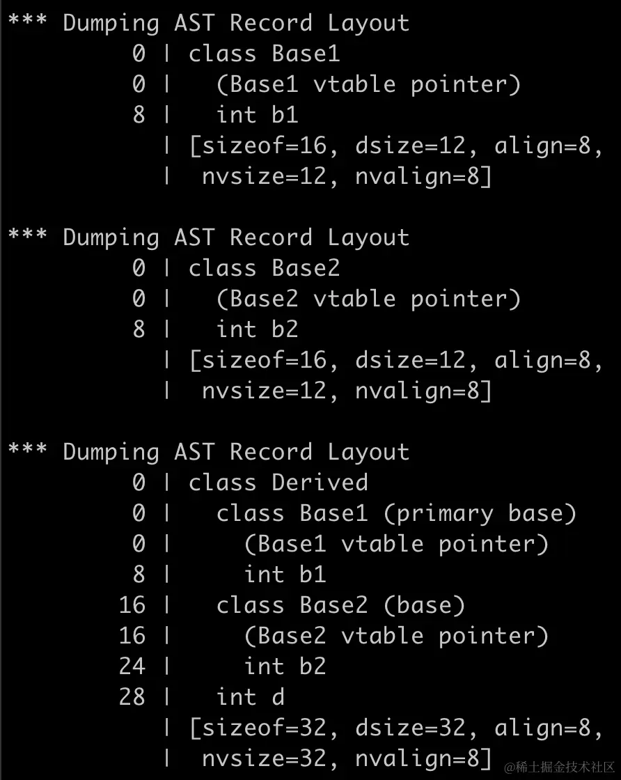 這裏先補充一點,虛繼承是藉助於虛基類表來實現,被虛繼承的父類的成員變量會放在虛基類表中,通過在對象中插入的虛基類表指針來訪問虛基類表,有點類似於虛函數表,實現方式不同的編譯器採用不一樣的方式,gcc和clang是虛函數表和虛基類表共用一個表,稱為虛表,所以只需要一個指針指向它,叫做虛表指針,而Windows平台的Visual Studio是採用兩個表,所以Windows下對象裏會有兩個指針,一個虛函數表指針和一個虛基類表指針,虛基類的實現細節後面再詳細分析。