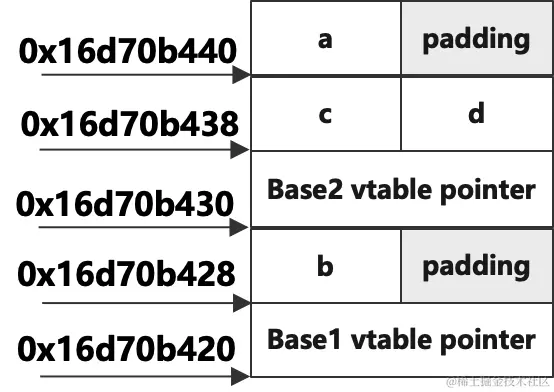 所以,分析的結論就是子類對象的內存佈局是這樣的,首先是從Base1父類繼承來的虛函數表指針,佔用8字節,接着是繼承來的b1成員變量,加上填充的4字節共佔用了8字節,再接着是從父類Base2繼承來的虛函數表指針,佔用8字節,之後是繼承的b2成員變量,佔用4字節,子類自己的成員變量d緊跟着排列在後面,總共32字節。佈局示意圖如下: