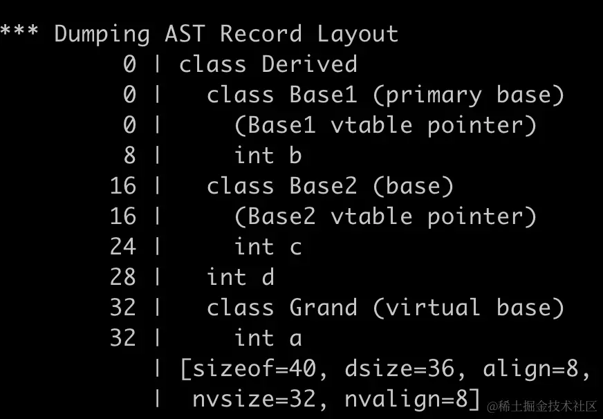 改為虛繼承後,obj.a = 1;這行代碼能編譯通過了,不會出現名字衝突了。我們來看看孫子類Derived的對象的大小,竟然是40字節,增大了這麼多,還是使用上面的命令來dump出對象的內存佈局,結果如下圖,截取部分: