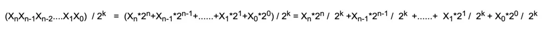 通過 公式1以及 公式2,我們可以得出當任意一個十進制除以一個2^k^的數時,我們可以將這個十進制轉換成公式1的表示形式: