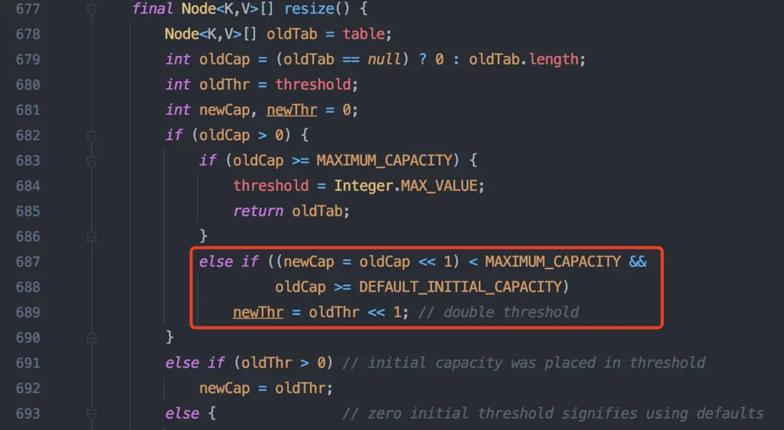 當存入HashMap的元素佔比超過整個容量的75%(默認加載因子 DEFAULT_LOAD_FACTOR = 0.75)時,進行擴容,而且在不超過int類型的範圍時,左移1位(長度擴為原來2倍)