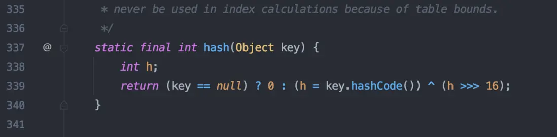 PS:其實這裏的算法可以研究下,hashcode() 是一個 native 修飾的方法,返回一個 int 類型的值(根據內存地址換算出來的一個值),然後將這個值無符號右移16位,高位補0,並與前面第一步獲得的hash碼進行按位異或^ 運算。
